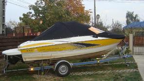 Husa de mars,se poate folosi si ca bimini-top,,parasolar daca se desfac geamurile laterale,care sunt prinse cu fermoare de partea superioara,si cu capse de chila barci.