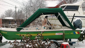 Husa de mars,se poate folosi si ca bimini-top,,parasolar daca se desfac geamurile laterale,care sunt prinse cu fermoare de partea superioara,si cu capse de chila barci.