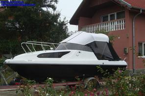 Husa de mars,se poate folosi si ca bimini-top,,parasolar daca se desfac geamurile laterale,care sunt prinse cu fermoare de partea superioara,si cu capse de chila barci.
