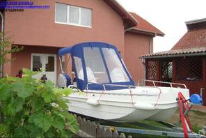Husa de mars,se poate folosi si ca bimini-top,,parasolar daca se desfac geamurile laterale,care sunt prinse cu fermoare de partea superioara,si cu capse de chila barci.